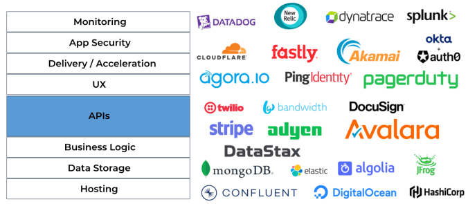 Much of this common plumbing represents services provided by APIs that can be easily plugged into the application. Usually teams want to write custom code only for the parts of the application that can generate competitive advantage and “outsource” the rest. I highlight APIs in the stack, as that is a huge area by itself. Some of the biggest independent software providers, like Twilio for communications and Stripe for payments, deliver all their services through APIs.